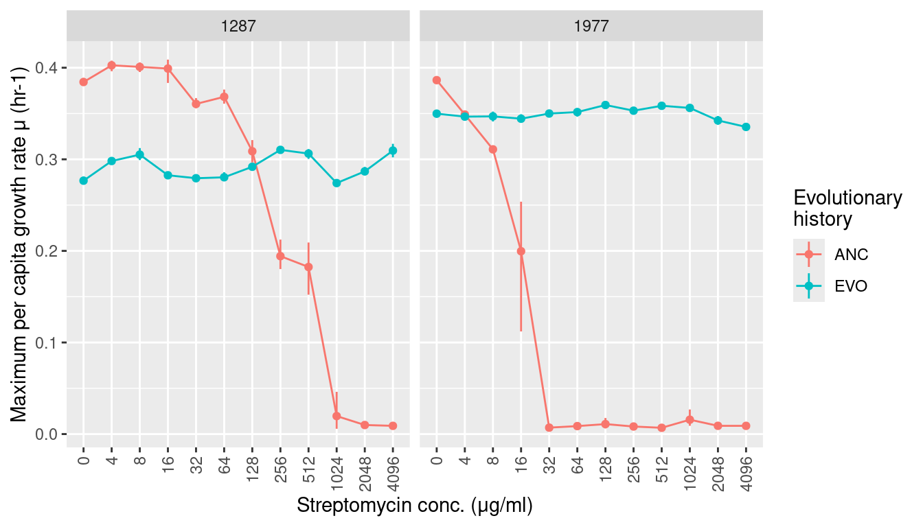 labs(y = "Maximum per capita growth rate μ (hr-1)", x = "Streptomycin conc. (μg/ml)",