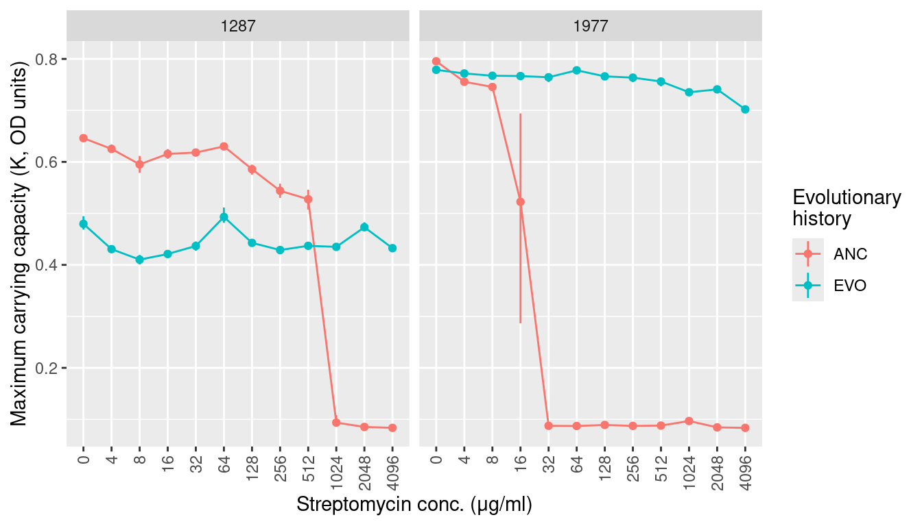 labs(y = "Maximum carrying capacity (K, OD units)", x = "Streptomycin conc. (μg/ml)",