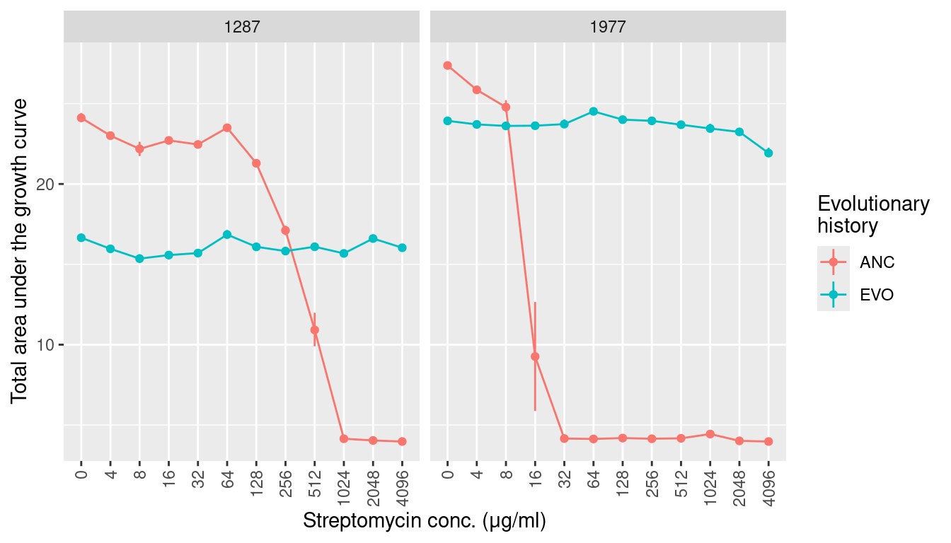 We’ll now examine how the monoculture growth changed with respect to evolutionary history and streptomycin concentrations