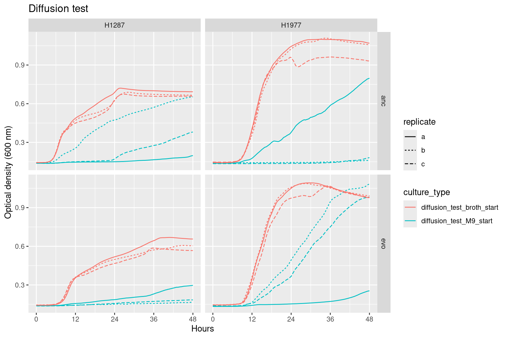 gcurves %>%filter(str_detect(culture_type, "diffusion")) %>%filter(str_detect(strain, "NANA", negate=TRUE)) %>%ggplot() + ggplot2::geom_line(aes(x = hours, y = OD600_rollmean, lty = replicate, color = culture_type, group =interaction(well, plate_name))) + ggplot2::labs(x ="Hours", y ="OD600") + ggplot2::scale_x_continuous(breaks =seq(0, 48, 12), labels =seq(0, 48, 12)) +labs(y ="Optical density (600 nm)", x ="Hours", title ="Diffusion test") +facet_grid(evolution~strain)