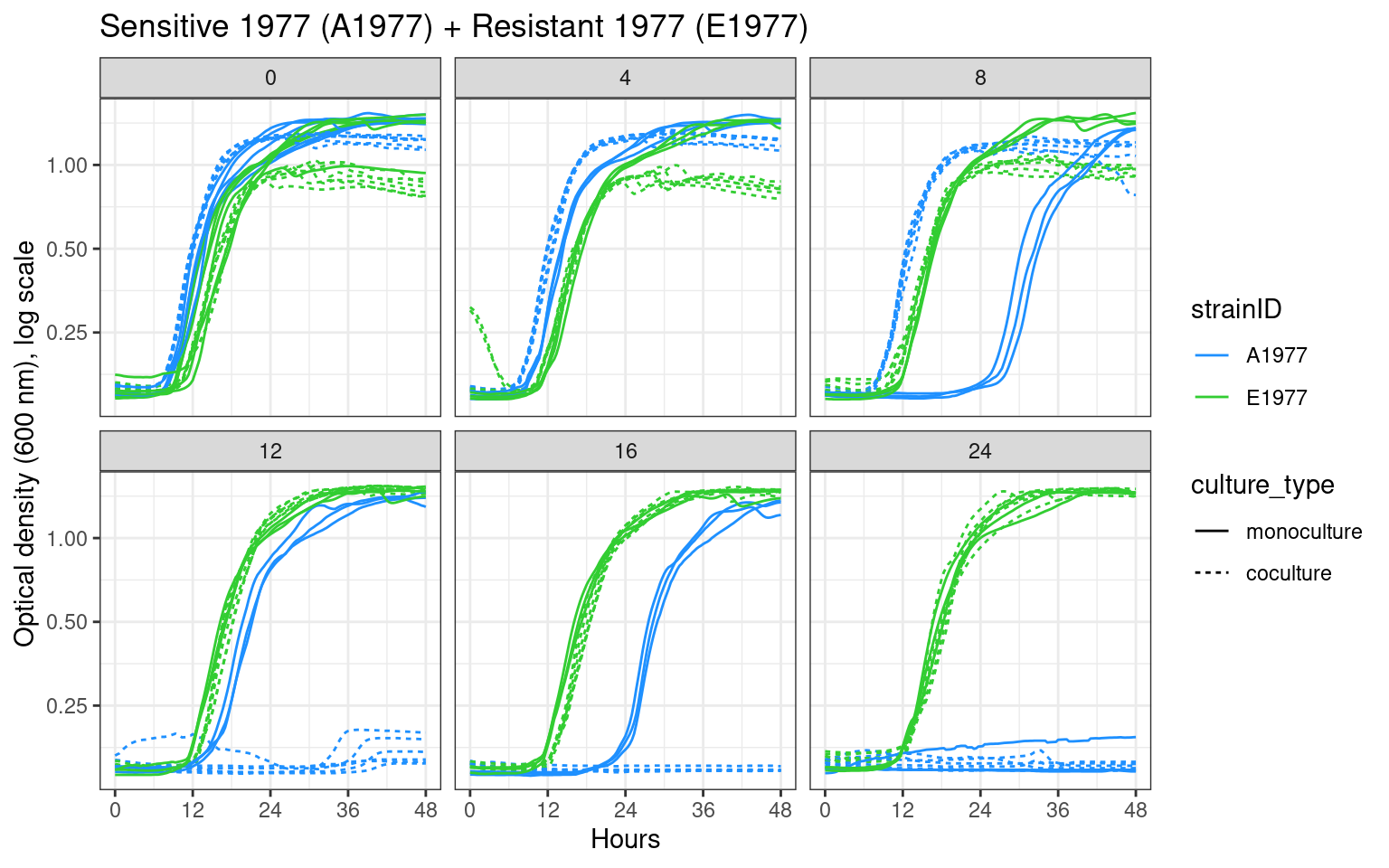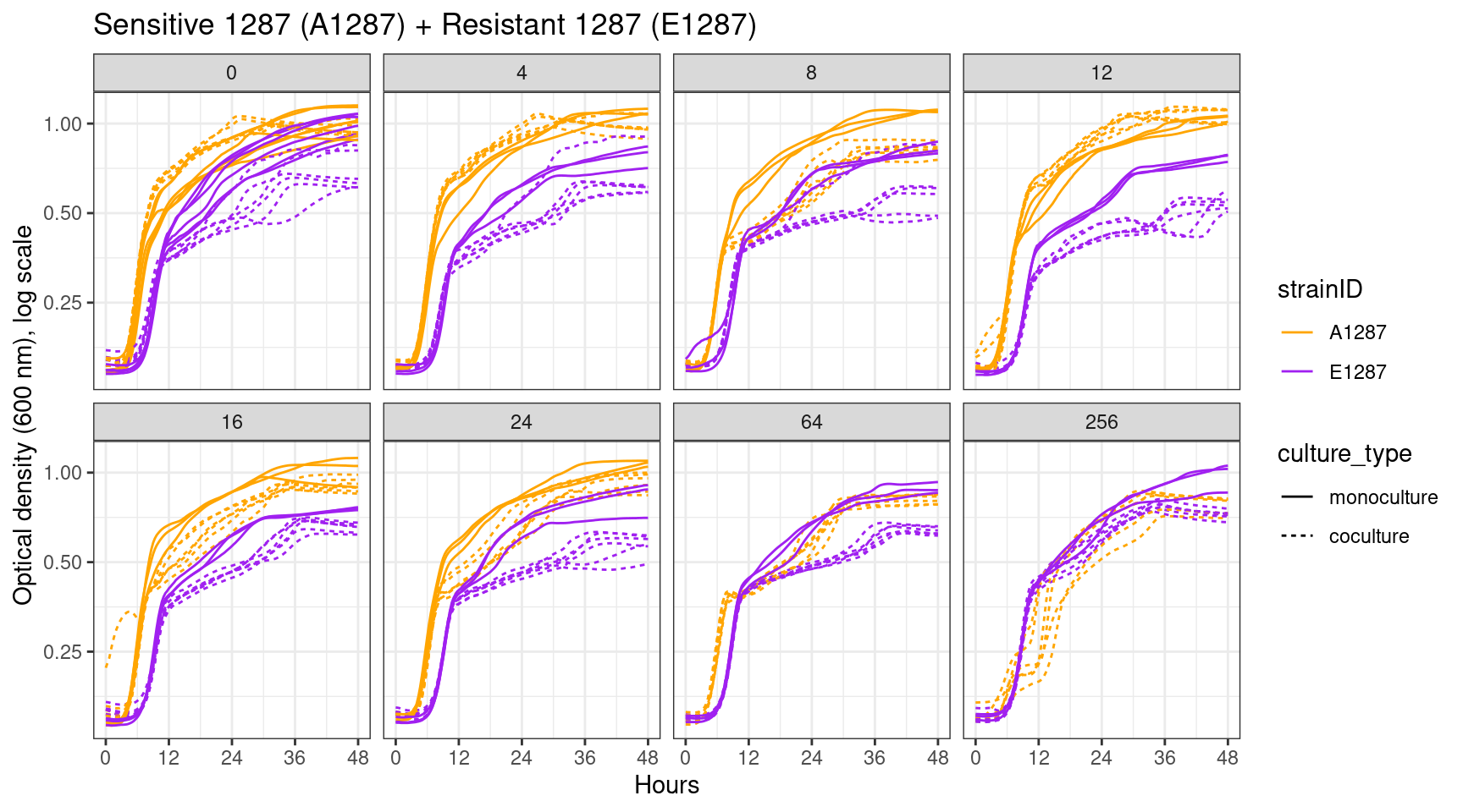 ### Formatting and plotting functions# This function collects all the data from monocultures and cocultures for the selected species pair# only monoculture data from streptomycin concentrations tested in co-cultures is includedcollect_sp_pairs <-function(df, competition_pair, strep_thresh){ strainpairs <- stringr::str_split(competition_pair, "_")[[1]] df %>%mutate(streptomycin =if_else(plate_name =="plate01", 0, streptomycin)) %>%mutate(strainID =paste0(stringr::str_to_upper(stringr::str_sub(evolution, start =1, end=1)), str_extract(strain, "\\d+"))) %>%filter(strainID %in% strainpairs) %>%filter(str_detect(culture_type, "diffusion", negate = T)) %>%filter(streptomycin <= {{ strep_thresh }}) %>%filter((culture_type =="coculture"& competition_pair == {{ competition_pair}} ) | culture_type =="monoculture") %>%mutate(culture_type =factor(culture_type, levels =c("monoculture", "coculture"))) }# this function plots the output from the collect_sp_pairs functionplot_sp_pairs <-function(df, title, ncol){ straincols <-c("A1287"="orange", "E1287"="purple", "A1977"="dodgerblue", "E1977"="limegreen") ggplot2::ggplot(df) + ggplot2::geom_line(aes(x = hours, y = OD600_rollmean, color = strainID, lty = culture_type, group =interaction(well, plate_name))) + ggplot2::labs(x ="Hours", y ="OD600") + ggplot2::scale_x_continuous(breaks =seq(0, 48, 12), labels =seq(0, 48, 12)) + ggplot2::labs(y ="Optical density (600 nm), log scale", x ="Hours", title = {{title}}) + ggplot2::scale_color_manual(values = straincols) + ggplot2::scale_y_continuous(trans ="log", breaks =c(0, 0.25, 0.5, 1)) + ggplot2::facet_wrap(~streptomycin, ncol = {{ncol}}) + ggplot2::theme_bw()}