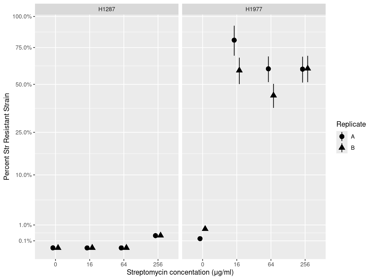 Figure 1: Results of long-term competition experiments between the Streptomycin Sensitive and Resistance forms of each species: H1287 = Citrobacter koseri 1287 and H1977 = Pseudomonas chlororaphis 1977. Vertical axis depicts the percentage of the Streptomycin resistant form after eight 48 hour transfers. Horizontal axis depicts the four streptomycin concentrations tests. Shape depicts the experimental replicate. Error bars are errors from the ML estimator and standard propagation of error.