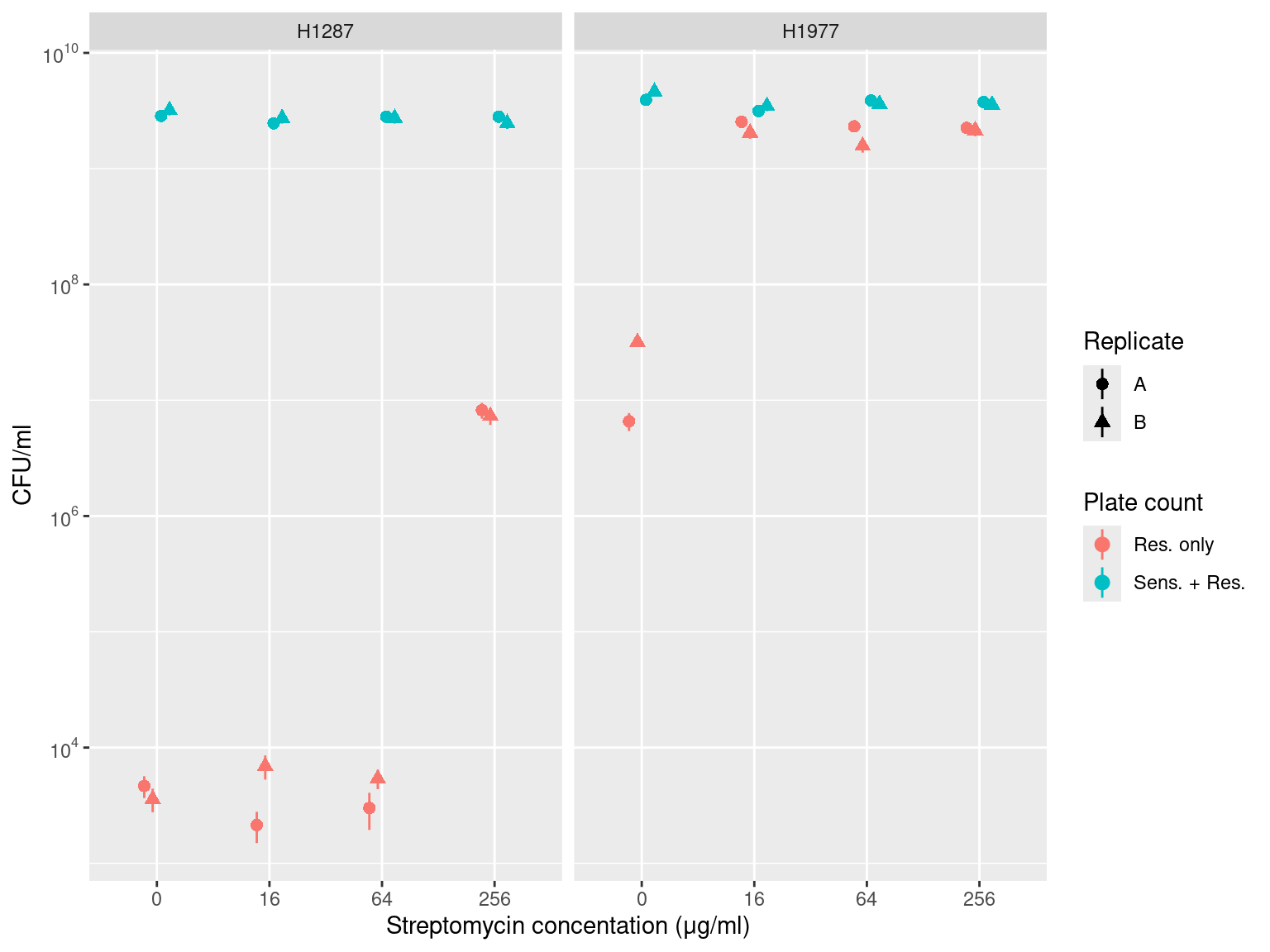 Figure 2: Results of long-term competition experiments between the Streptomycin Sensitive and Resistance forms of each species: H1287 = Citrobacter koseri 1287 and H1977 = Pseudomonas chlororaphis 1977. Vertical axis depicts the absolute number of Colony Forming Units (CFU) per ml of culture after eight 48 hour transfers. Horizontal axis depicts the four streptomycin concentrations tests. Point color depicts whether counts were made on an agar plate allowing growth of both the sensitive and resistant forms (blue, ‘Sens. + Res.’) or the resistant form only (red, 5000 ug/ml streptomycin, ‘Res. Only’). Shape depicts the experimental replicate. Error bars are errors from the ML estimator.